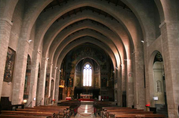 Around the circular window the façade bears reliefs with symbols of the Evangelists and with the Agnus Dei. The interior, with a single nave, with no transept and with transverse arches supporting the pitched roof, is the result of renovation carried out at the beginning of the 20th c. The church is rich in paintings by 16th c. artists from Gubbio (the Nuccis, the Basilis), but also by non- local artists (Sinibaldo Ibi, Giuliano Presutti, Dono Doni). Most significant is the baroque chapel which opens up in the middle of the wall on the right: it contains frescoes by Allegrini and a canvas (“La Nascita della Vergine”- “Birth of the Virgin”) by Gherardi. On the left of the high altar is the Seat of the Magistrates, with mock marquetry by Benedetto Nucci. In the choir can be found the Episcopal Throne, carved round about the middle of the 16th c.