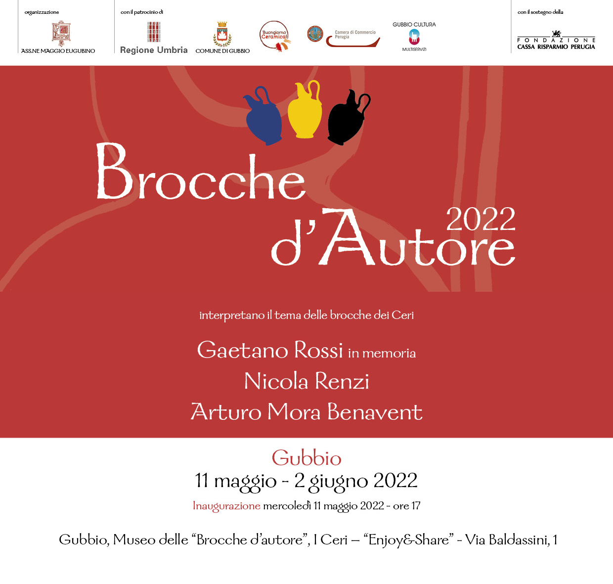 Ogni anno l’associazione ‘Maggio Eugubino’, con il patrocinio del Comune, promuove e organizza l’esposizione Brocche d’autore con la finalità di sottolineare il rapporto tra i Ceri e la ceramica d’arte contemporanea. Dal 10 maggio al 2 giugno, le brocche sono in mostra nel Museo delle Brocche d’Autore, nello spazio multimediale Enjoy&Share di Via Baldassini e nelle vetrine dei negozi del Centro Storico.