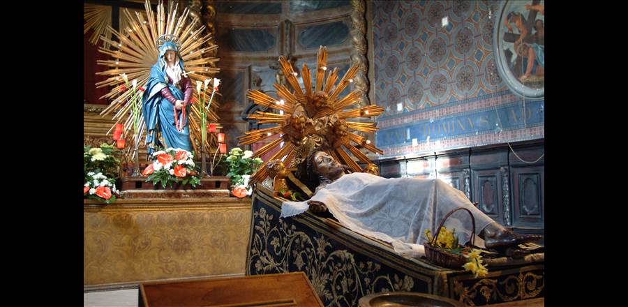 Nei giorni precedenti il Venerdì Santo, i ‘confratelli’ di Santa Croce della Foce iniziano i preparativi degli apparati processionali, con i due simulacri pronti per essere portati in processione: il Crocifisso viene deposto sul cataletto e la Vergine Addolorata nella settecentesca raggiera.