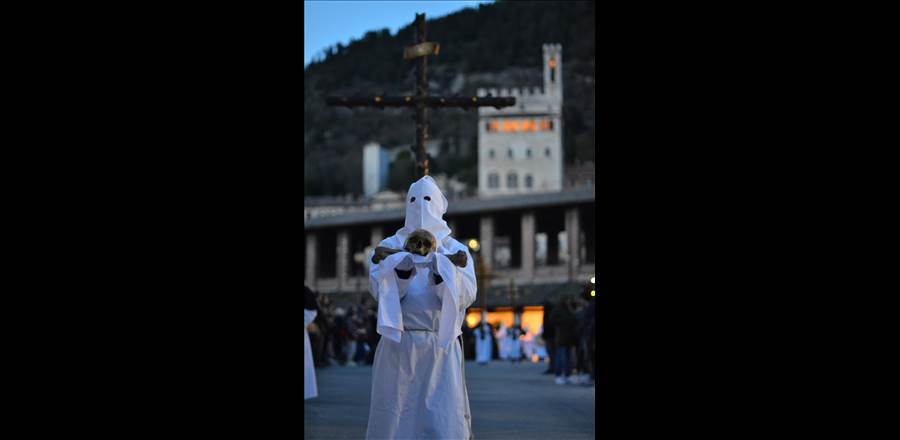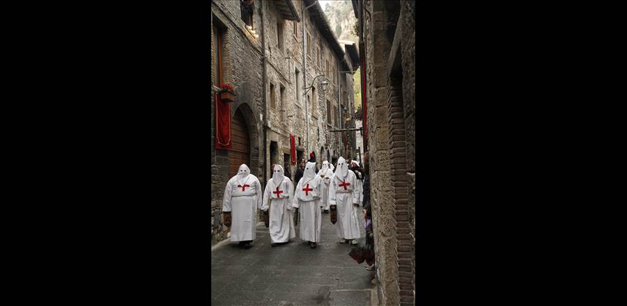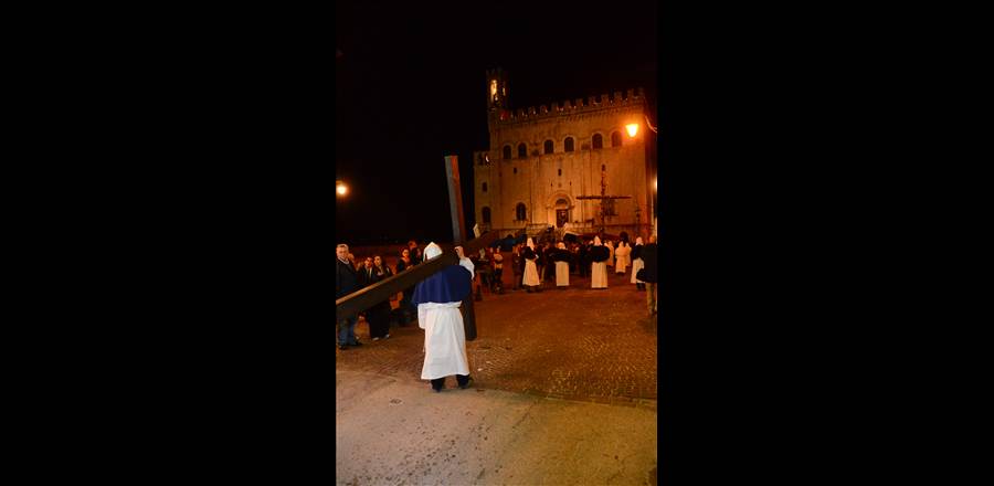 Organizzata dalla “Venerabile Confraternita di Santa Croce della Foce”. É una rappresentazione simbolica della Passione di Cristo che si ripete da secoli secondo una tradizione che non ha mai conosciuto soste. Il corteo è aperto da confratelli vestiti di sacco che suonano le ‘battistrangole’ (strumenti che provocano un suono di ferraglia) ed altri che portano il teschio simboleggiante il Golgota ed i simboli della Passione.